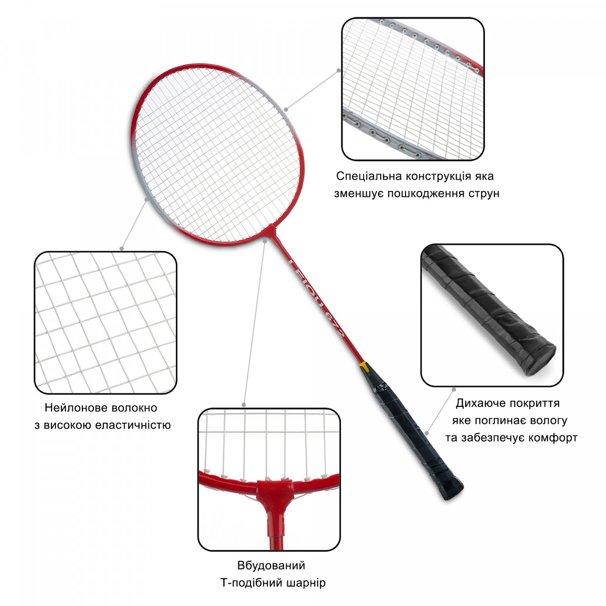 Важливою деталлю є вузол Т-подібної форми, який з'єднує обід і стрижень ракетки; ракетки для бадмінтону мають середнє натяжіння струн, що забезпечує максимальний термін експлуатації.