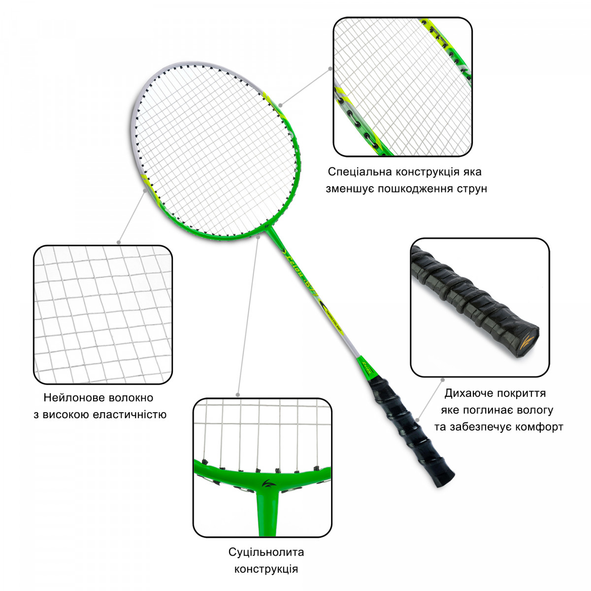 Важливою деталлю ракетки є її суцільнолита конструкція, яка має високу міцність з хорошими аеродинамічними властивостями; ракетки для бадмінтону мають середнє натяжіння струн, що забезпечує максимальний термін експлуатації.