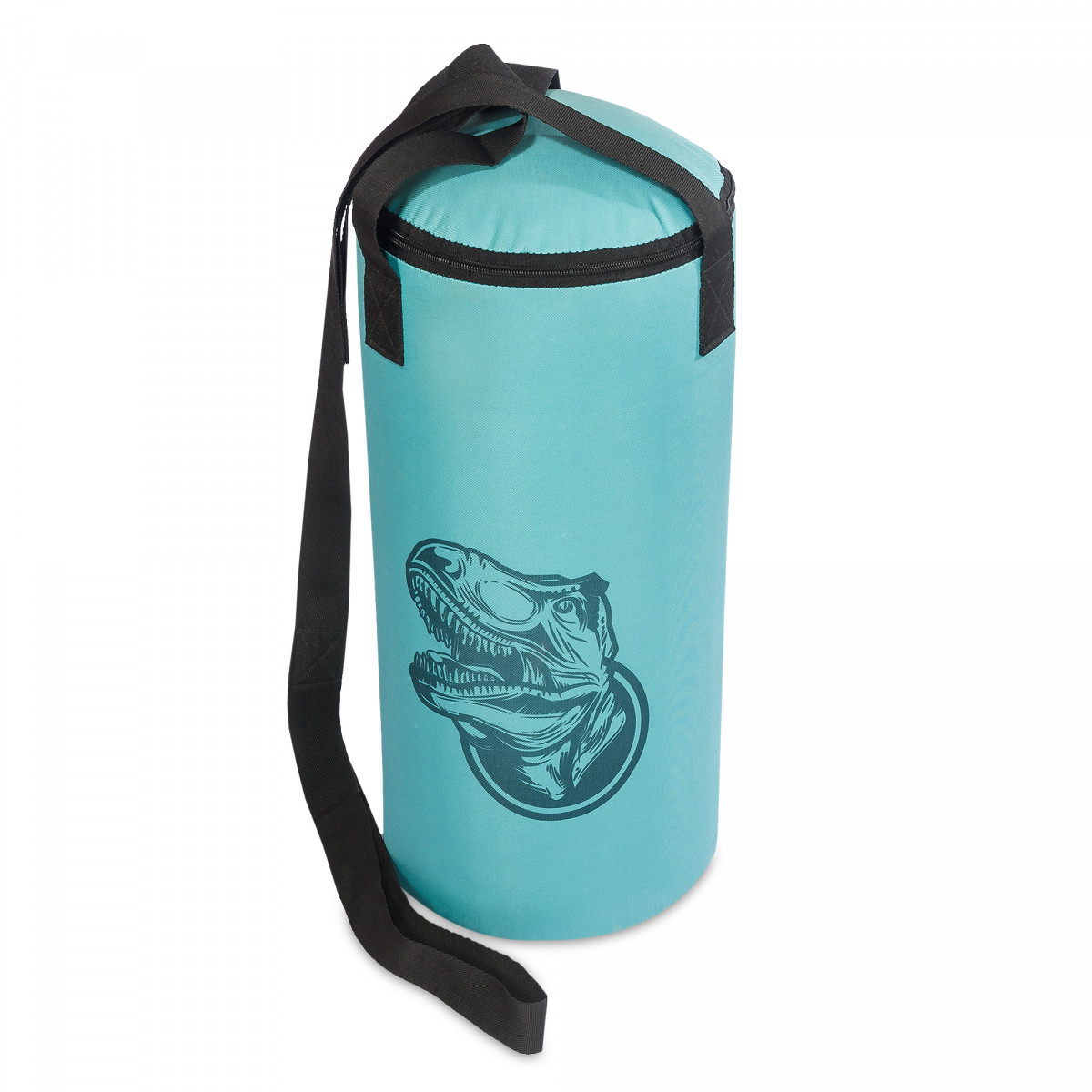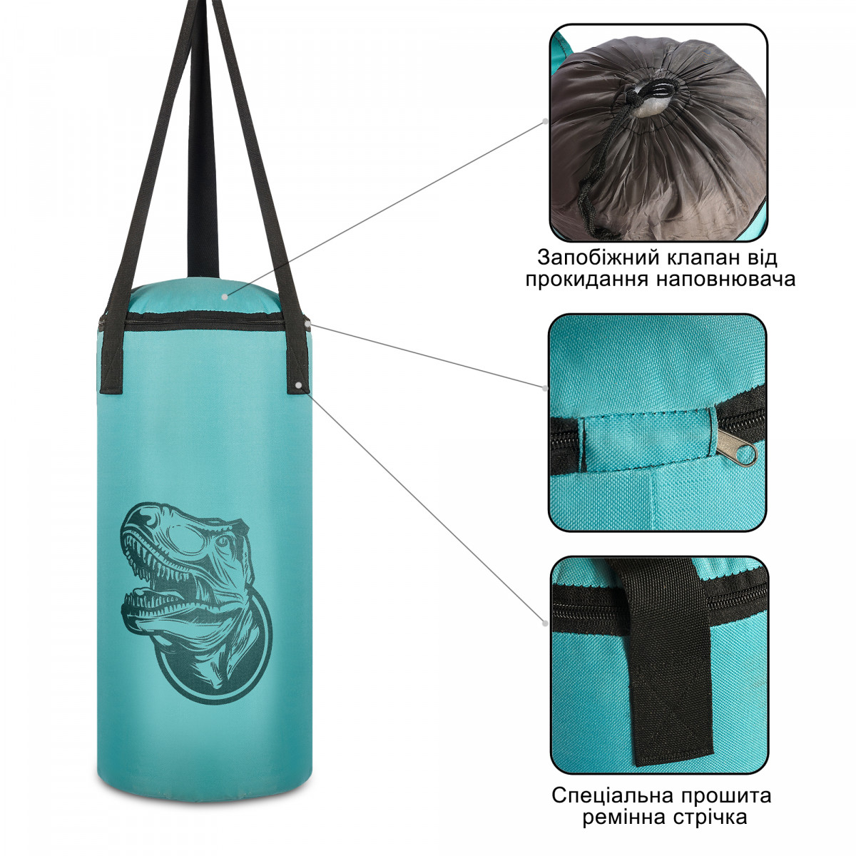 Дитячий боксерський мішок виготовлений з міцної тентової тканини з ПВХ просоченням. Підвішується за допомогою ременя з петлею. Обладнаний захисним клапаном від просипання наповнювача. Набір скомплектований парою боксерських бинтів.