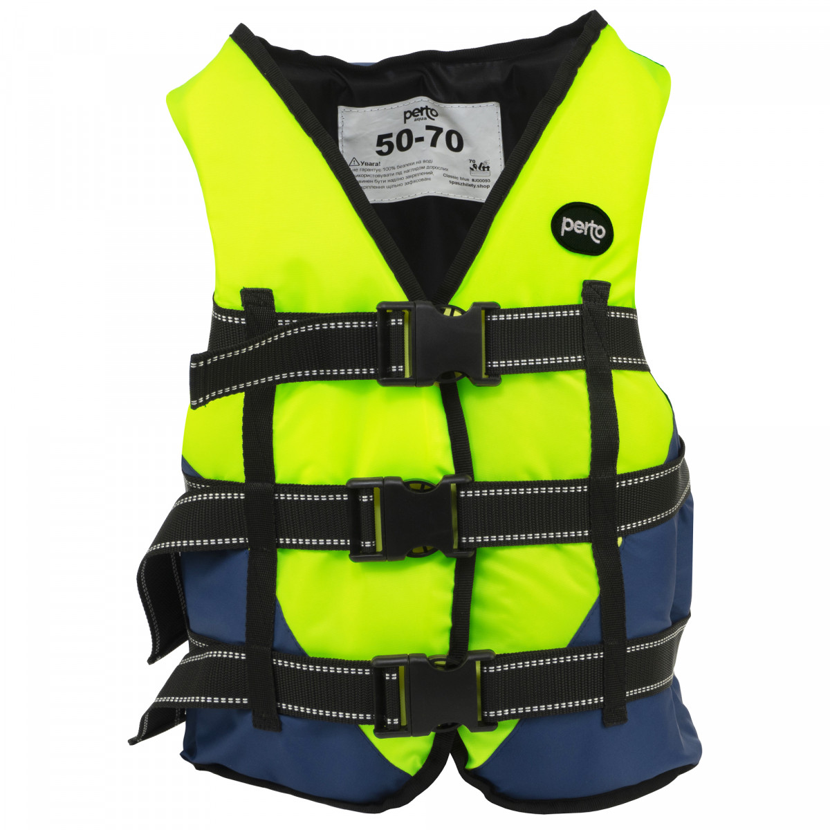 Жилет страхувальний PERTO Classic blue 50-70 Салатово - Синього кольору оснащений трьома надійними закріплювальними ременями, що дає можливість добре триматися на тілі.