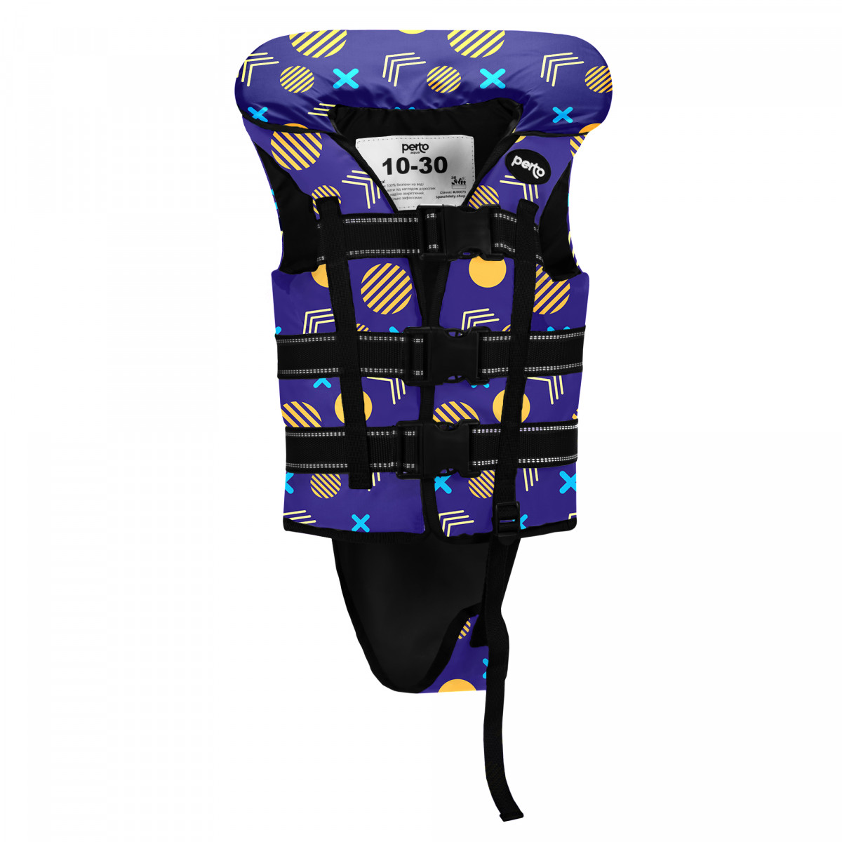 Жилет страхувальний дитячий PERTO Exclusive 10-30 Фіолетовий патерн оснащений трьома надійними фіксаційними ременями, коміром-підголовником, паховим ременем, який забезпечують додатковий захист. Лямка на підголівнику дозволить батькам контролювати положення дитини у воді.