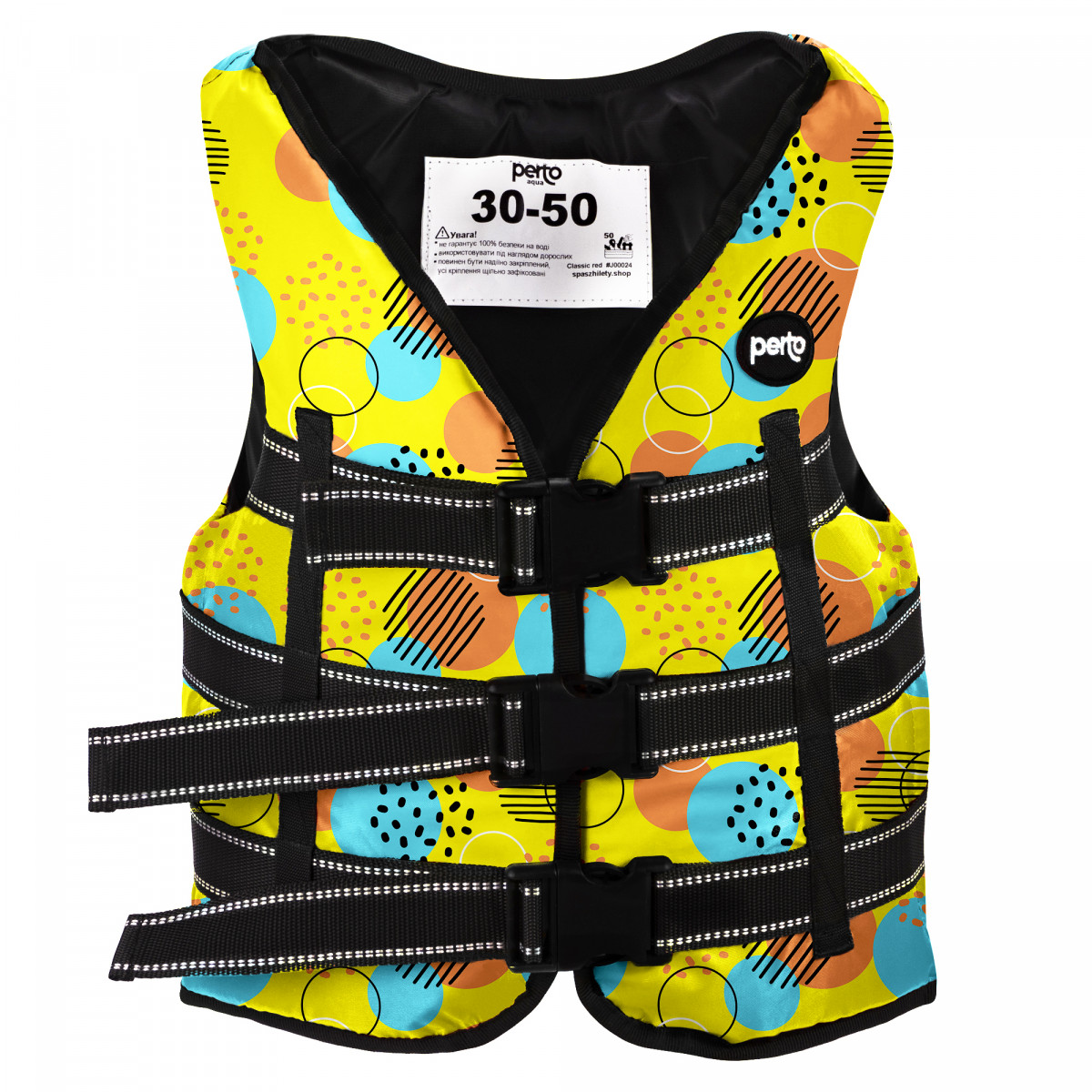 Жилет страхувальний дитячий PERTO Exclusive 30-50 Жовтий патерн оснащений трьома надійними фіксаційними ременями, що дає можливість добре триматися на тілі.