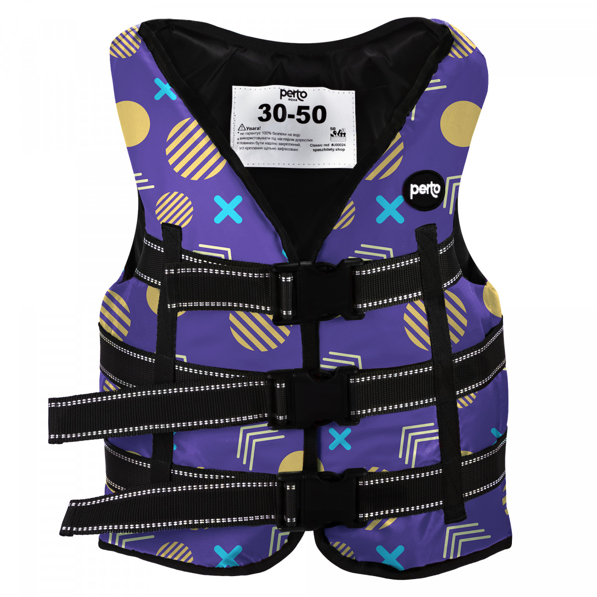 Жилет страхувальний дитячий PERTO Exclusive 30-50 Фіолетовий патерн оснащений трьома надійними фіксаційними ременями, що дає можливість добре триматися на тілі.