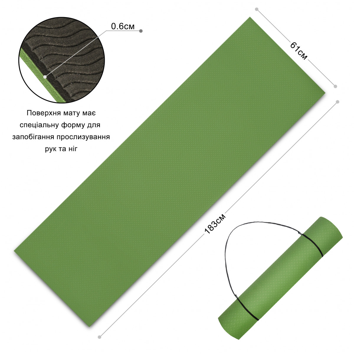 Рельєфна поверхня килимка виключає його ковзання на будь-якому покритті та прилипанні долонь навіть при їх зволоженні.