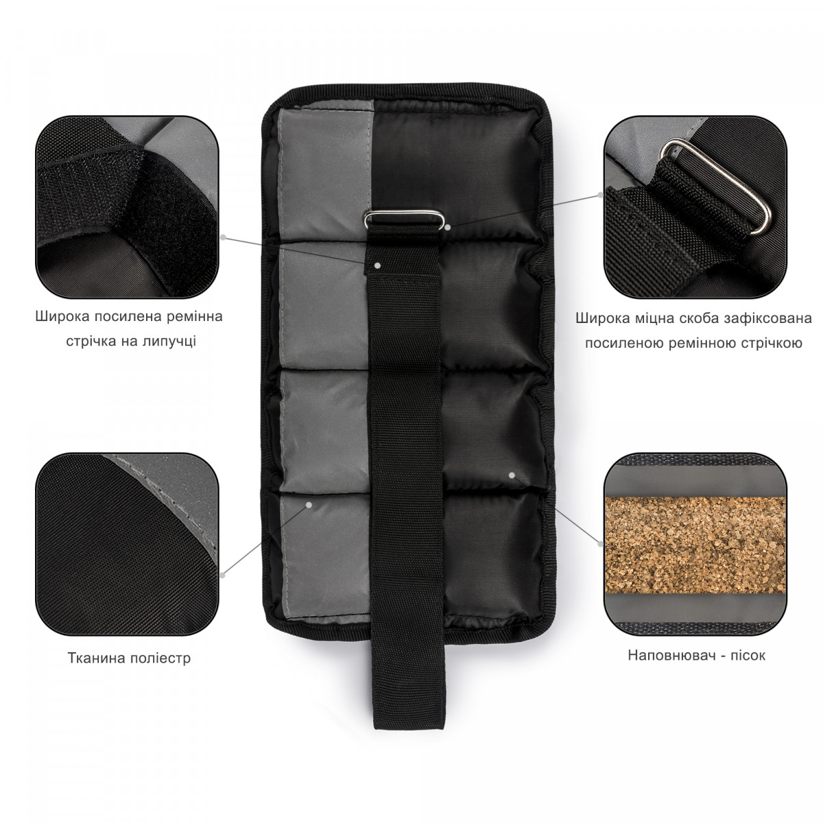 Обважнювачи Champion Garment Factory 00438-1.0 світловідбивні з фіксованою вагою 1.0 (пара 2.0 кг). Для фіксації використовується ремінна стрічка шириною чотири сантиметри. Спосіб фіксації - липучка, кріплення - одне, наповнювач - пісок. Обважнювачі можливо використовувати з окружністю гомілки або передпліччя від 12,5 сантиметрів (діаметр 4 см) і до 31 (діаметр 10 см)