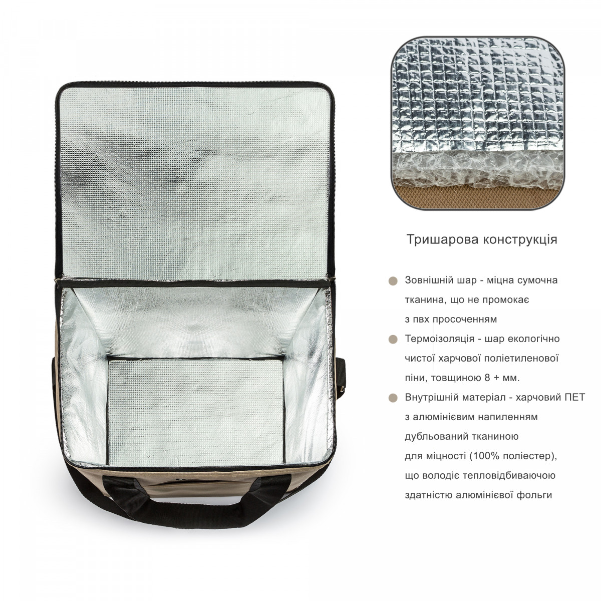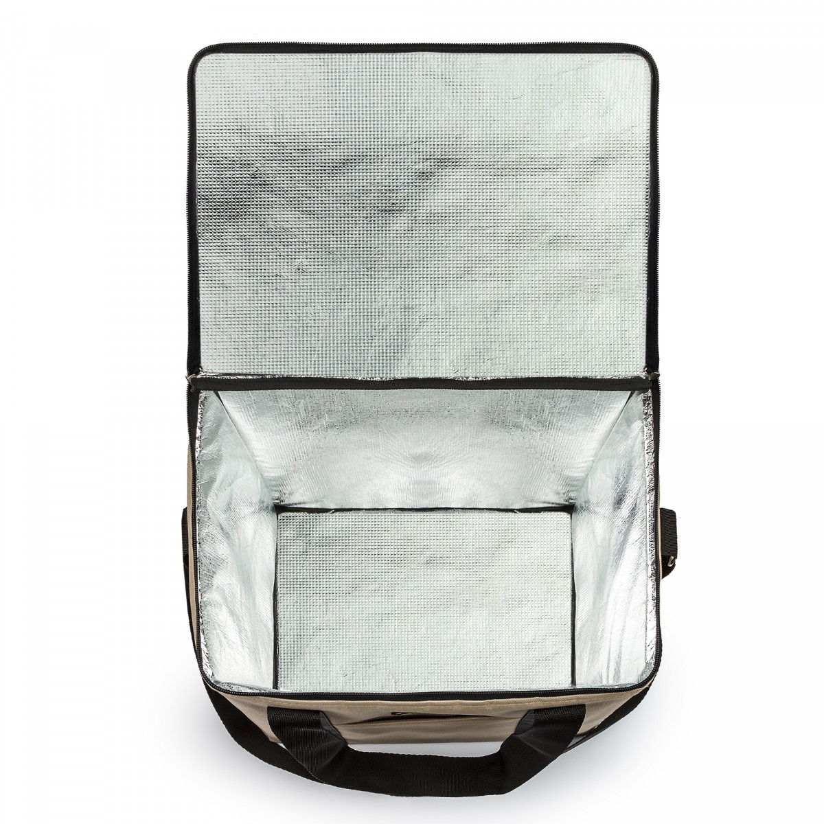 - Внутренний материал: пищевой ПЭТ с алюминиевым напылением, дублированный прочной тканью (100% полиэстер), обладающей теплоотражающими свойствами.