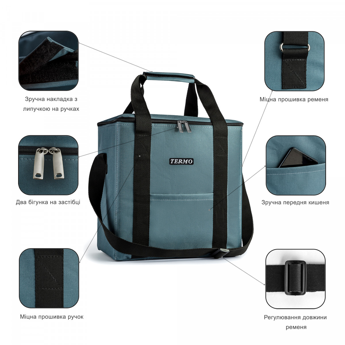 Просторная термосумка с одним центральным отделением и дополнительным карманом. Оснащена удобными ручками с застёжкой на "липучке" и плечевым ремнём. Идеально подходит для транспортировки охлаждённых или подогретых продуктов.