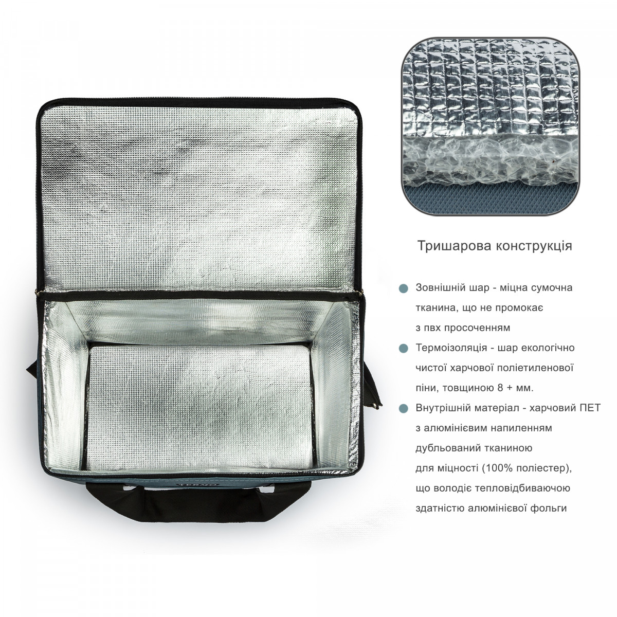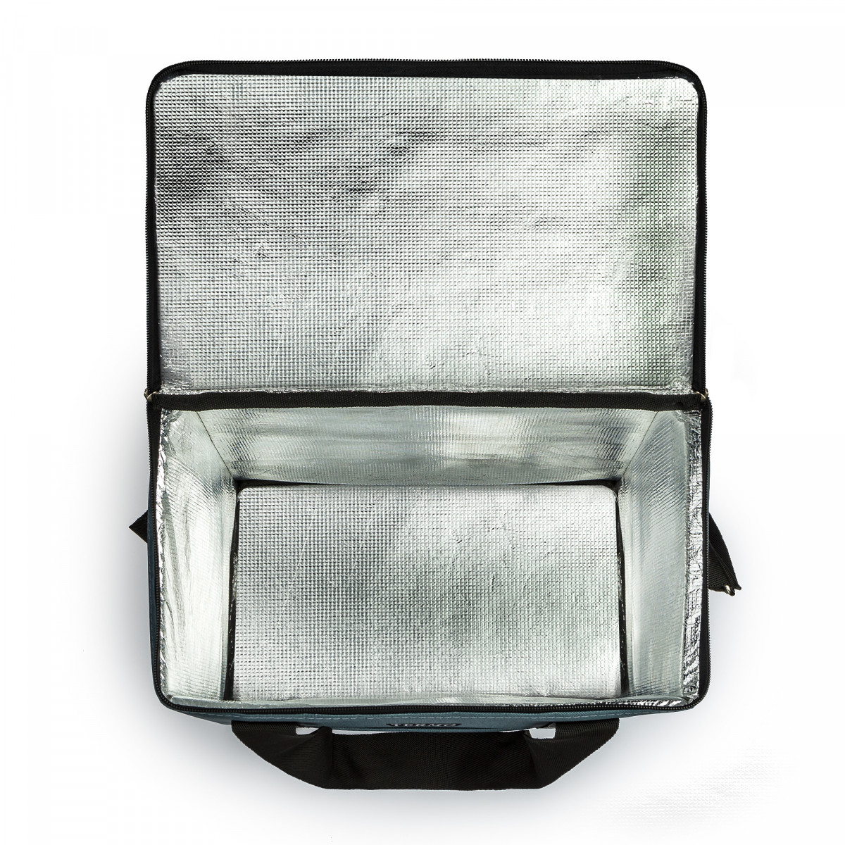 - Внутренний материал: пищевой ПЭТ с алюминиевым напылением, дублированный прочной тканью (100% полиэстер), обладающей теплоотражающими свойствами.