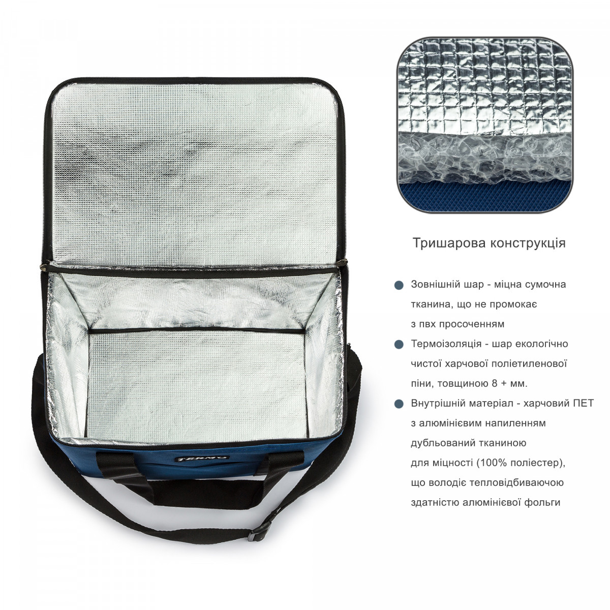- Внутреннее покрытие: пищевой ПЭТ с алюминиевым напылением и тканевой основой (100% полиэстер), обладающий теплоотражающими свойствами.