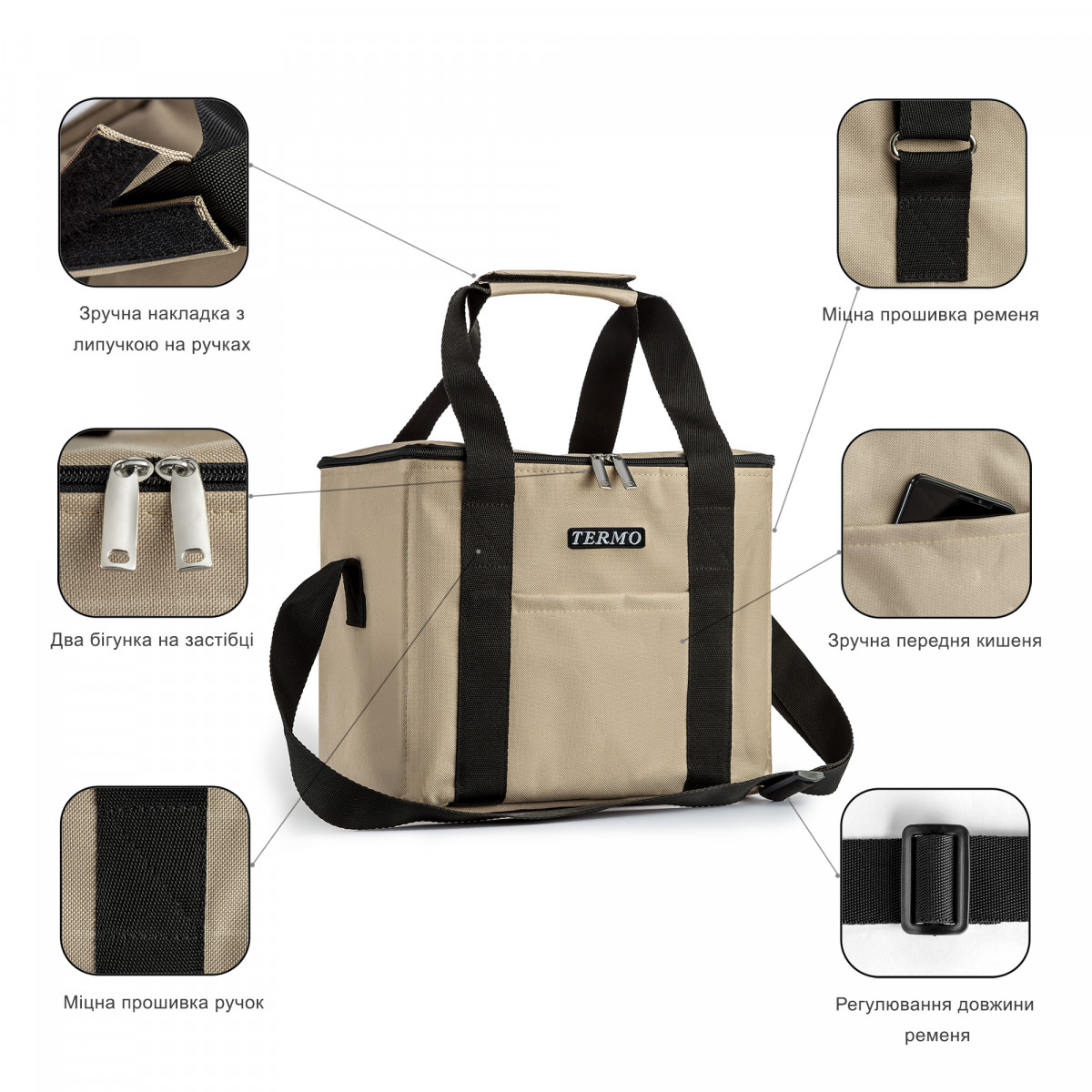 - Удобство: оснащена удобными ручками с соединительной "липучкой" и регулируемым плечевым ремнем.