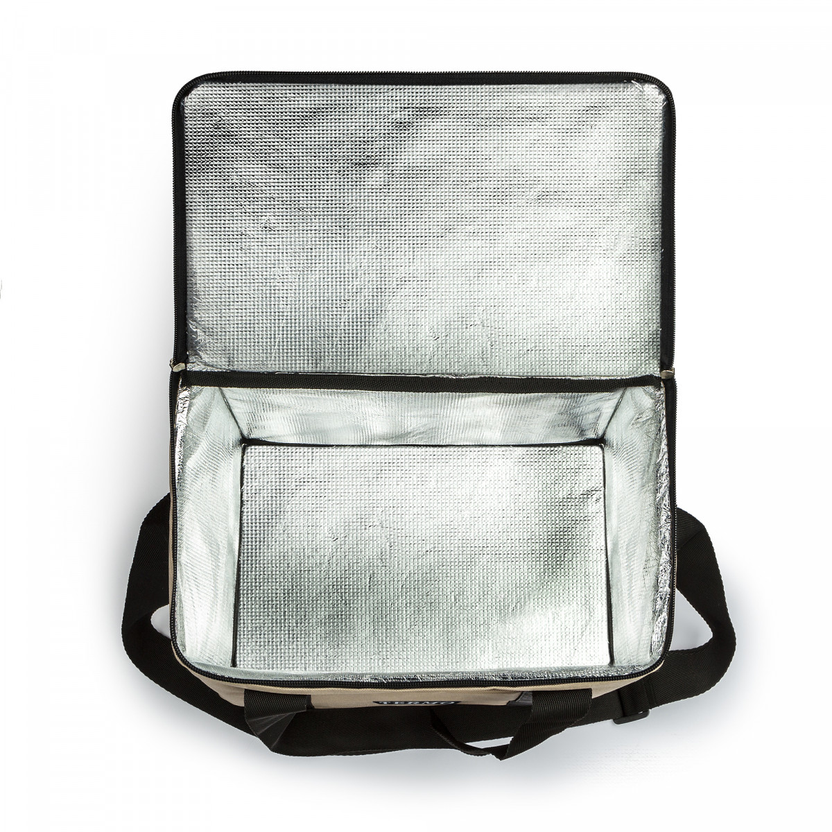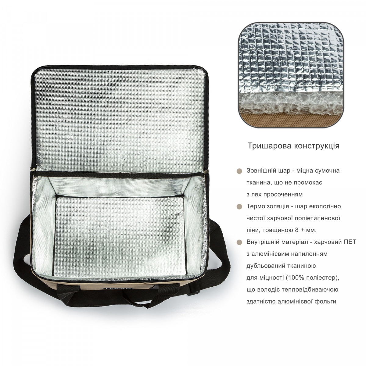 - Внутреннее покрытие: пищевой ПЭТ с алюминиевым напылением и тканевой основой (100% полиэстер), обладающий теплоотражающими свойствами.