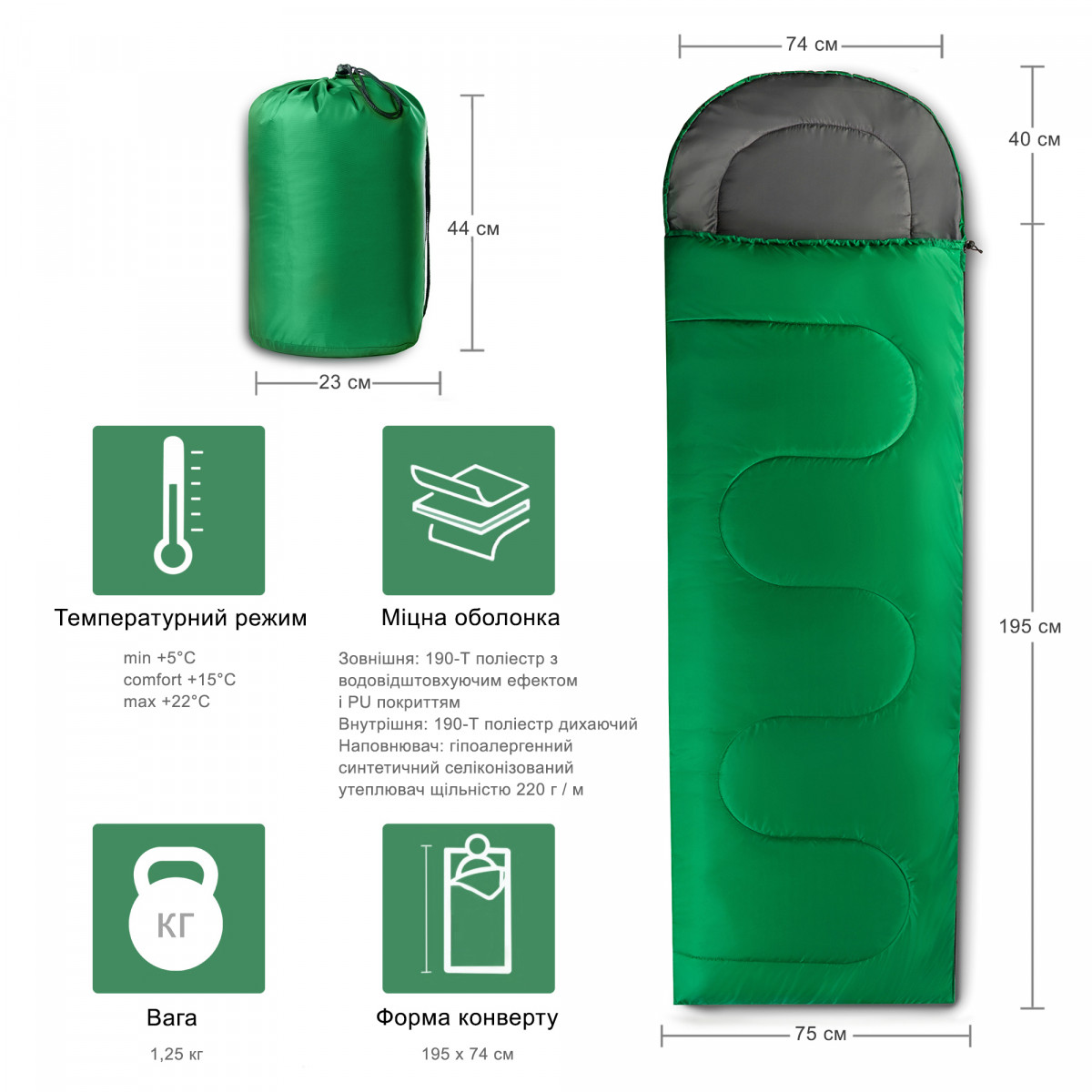 Зовнішня тканина 190-т поліестер з водовідштовхуючим ефектом і PU покриттям. Підкладка - дихаюча 190-т поліестер, синтетичний силіконізований утеплювач складається з пустотілих мікро волокон, щільністю 220 г / м, зручний капюшон, двосторонні бігунки, чохол в комплекті.