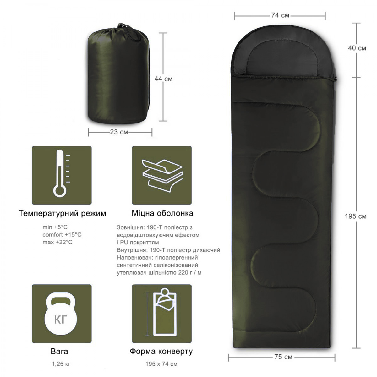 Зовнішня тканина 190-т поліестер з водовідштовхуючим ефектом і PU покриттям. Підкладка - дихаюча 190-т поліестер, синтетичний силіконізований утеплювач складається з пустотілих мікро волокон, щільністю 220 г / м, зручний капюшон, двосторонні бігунки, чохол в комплекті.