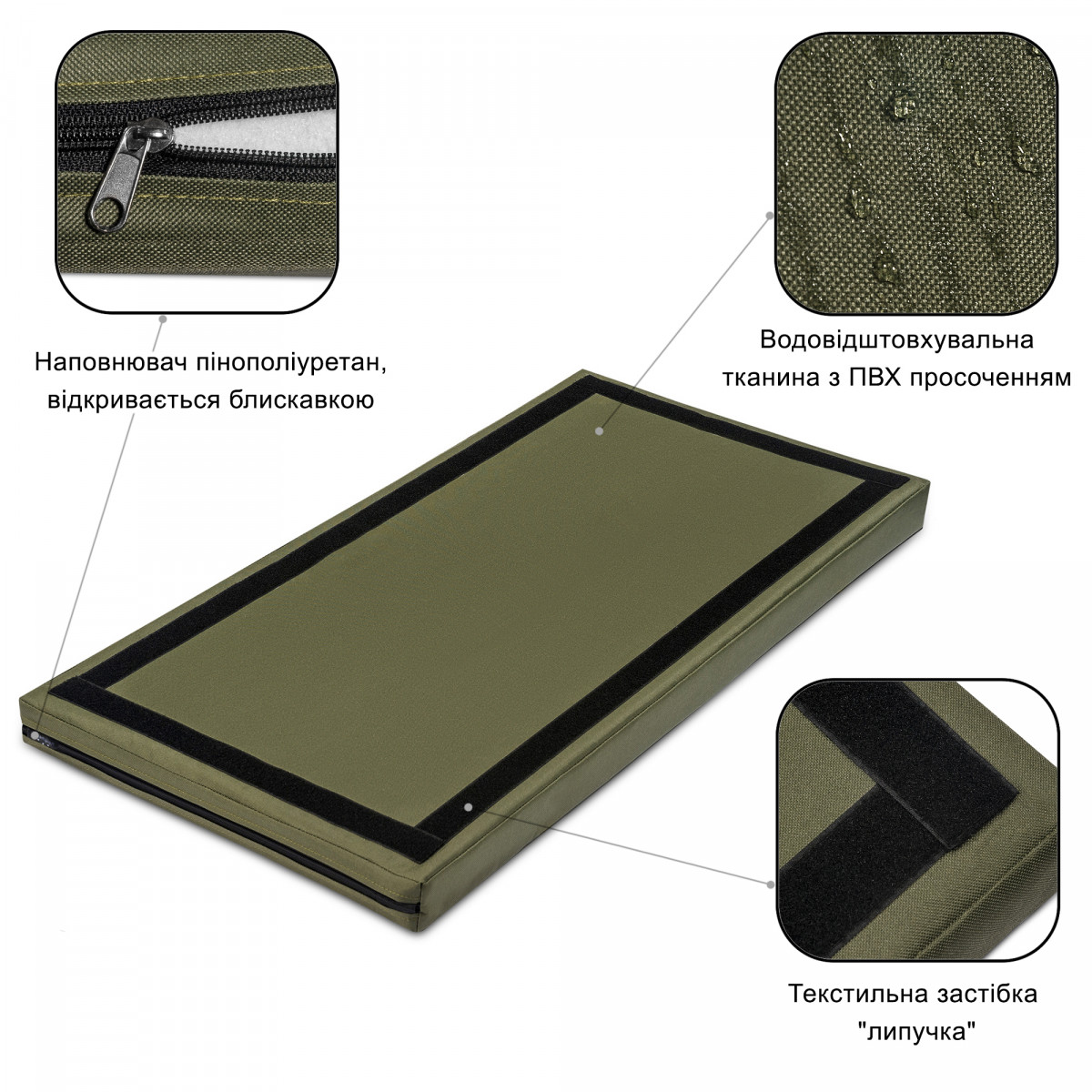 Чохол мата - конструктора виготовлений з міцної водовідштовхувальної тентової тканини з ПВХ просоченням з внутрішньої сторони. Наповнювач пінополіуретан. Мат має якісні амортизаційні та термоізоляційні показники. Виробляється двох типів модуль А і модуль В. Модуль серії B може з'єднуватися з модулем серії A ( MA00545 MA00546 MA00547 MA00548 MA00549 MA00550 MA00551 MA00552 MA00553 ). Для з'єднання модулей між собою використовується текстильна застібка "липучка". Завдяки цій властивості можливо зібрати мат практично будь - якої площини. В розібраному вигляді не займає багато місця для зберігання. Модулі серії А забезпечені збоку допоміжною текстильною застібкою для фіксації не зайнятих в з'єднанні клапанів. Для з'єднання модулей достатньо випрямити клапан модуля А та на нього помістити модуль В стороною з м'якою текстильною застібкою.