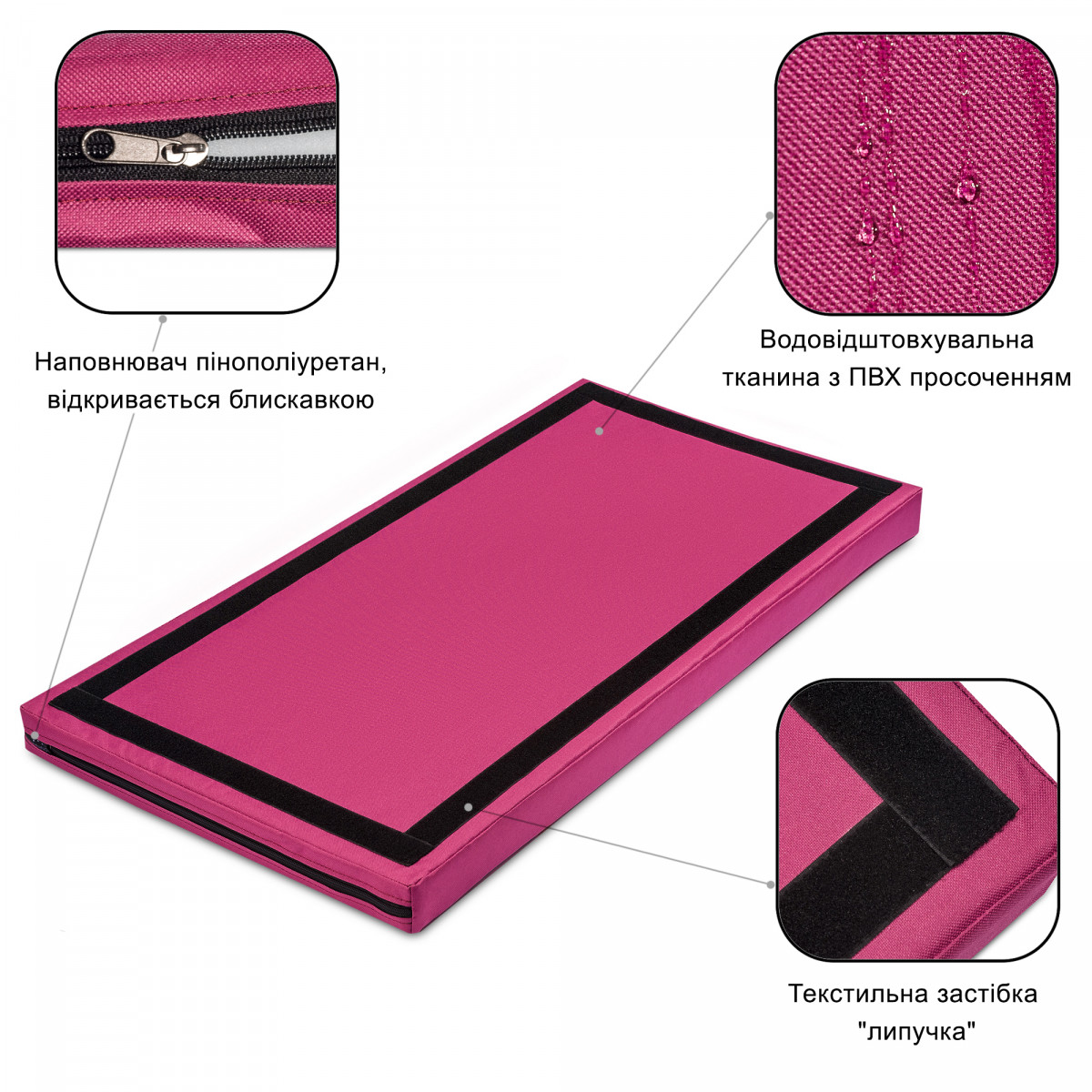 Чохол мата - конструктора виготовлений з міцної водовідштовхувальної тентової тканини з ПВХ просоченням з внутрішньої сторони. Наповнювач пінополіуретан. Мат має якісні амортизаційні та термоізоляційні показники. Виробляється двох типів модуль А і модуль В. Модуль серії B може з'єднуватися з модулем серії A ( MA00545 MA00546 MA00547 MA00548 MA00549 MA00550 MA00551 MA00552 MA00553 ). Для з'єднання модулей між собою використовується текстильна застібка "липучка". Завдяки цій властивості можливо зібрати мат практично будь - якої площини. В розібраному вигляді не займає багато місця для зберігання. Модулі серії А забезпечені збоку допоміжною текстильною застібкою для фіксації не зайнятих в з'єднанні клапанів. Для з'єднання модулей достатньо випрямити клапан модуля А та на нього помістити модуль В стороною з м'якою текстильною застібкою.