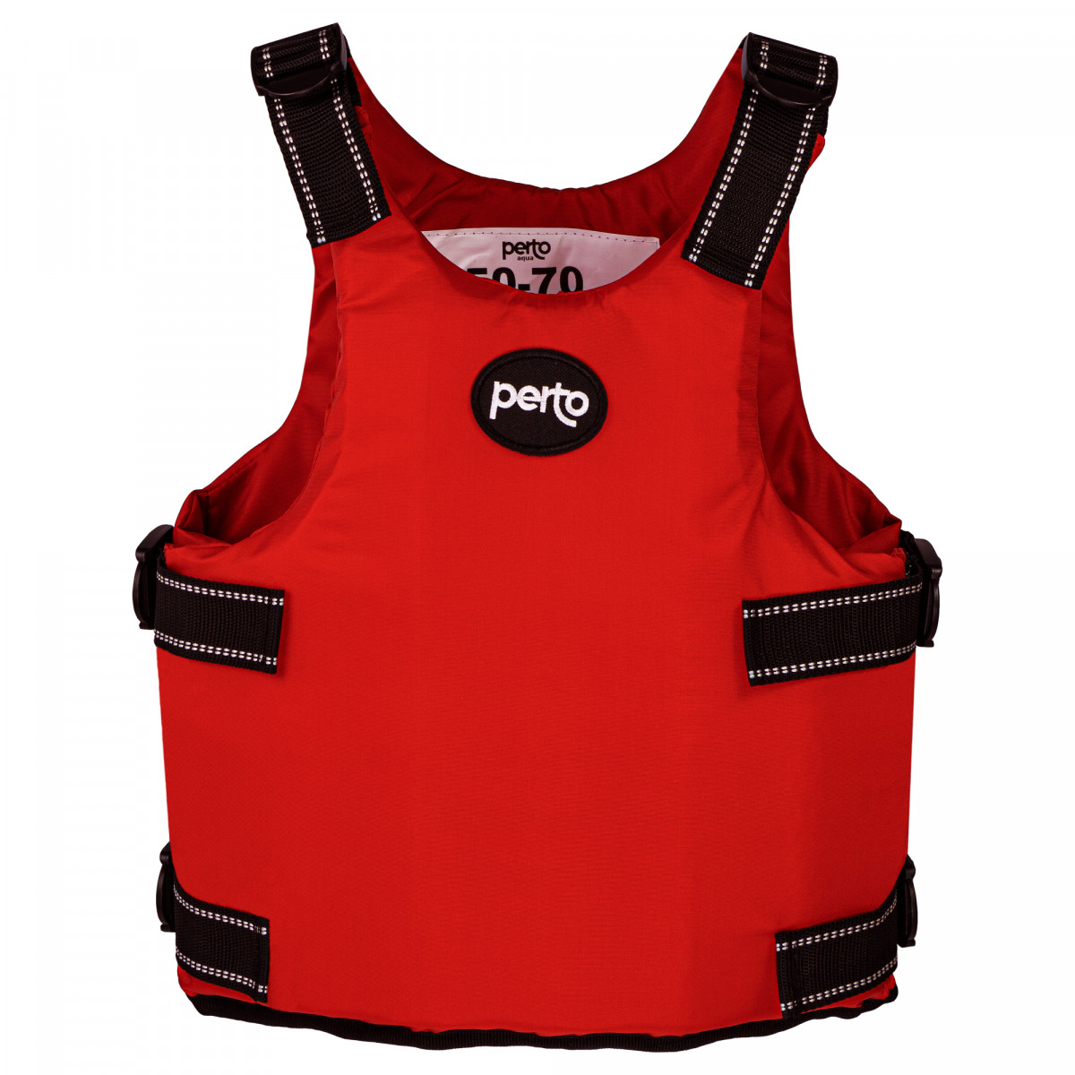 Жилет страхувальний PERTO Tropic red 50-70 Червоного кольору для дорослих оснащений чотирма надійними закріплювальними ременями по боках та двома ременями на плечах, що дає можливість добре триматися на тілі.