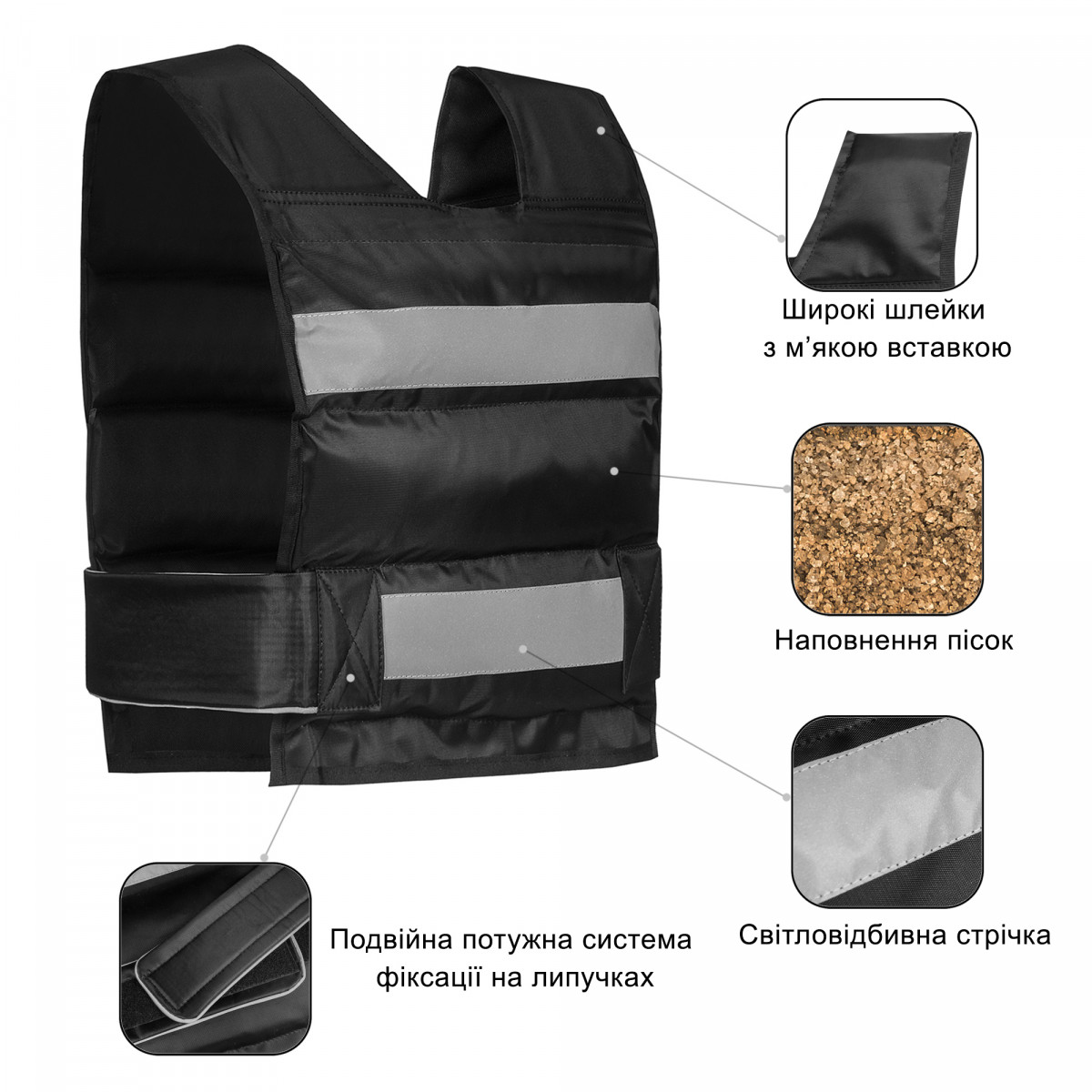 Жилет-обважнювач Champion світловідбивний з фіксованою вагою 6кг. Виготовлений з міцного матеріалу з вологовідштовхувальним просоченням, який витримує високі та інтенсивні навантаження. В якості наповнювача використовується пісок, герметично запакований в поліетиленові пакети (85 мкм). Жилет використовується для тренувань в різних видах спорту, допомагаючи досягти кращих результатів, роблячи їх більш ефективними.